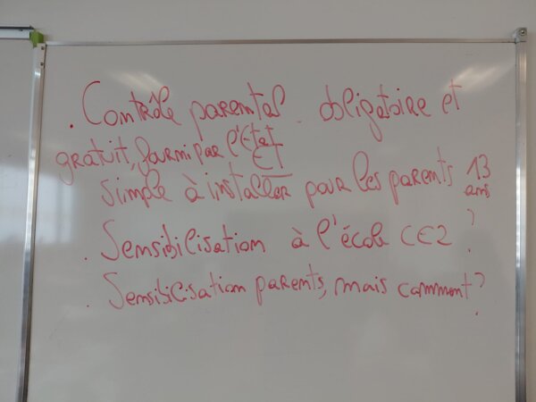 A la suite de ce questionnaire, les élèves ont été invités à réfléchir à des articles de loi. Les discussions tournaient beaucoup sur la création et la mise à disposition d’applications de contrôle parental ou qui pouvaient avoir la capacité de filtrer les contenus afin de ne proposer que des contenus adaptés aux mineurs, ainsi que sur la sensibilisation. Nous avons réussi à dégager des idées, inscrites au tableau.