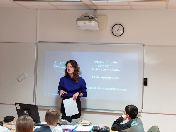 Jeudi 11 décembre, Madame Mazière, ancienne administratrice des services de l’Assemblée nationale, actuellement inspectrice générale des finances et membre de l’association « Parlons démocratie », est venue pendant deux heures rencontrer la classe de 6ème 4. A l’aide d’un diaporama, elle a d’abord présenté aux élèves les institutions de la République française, notamment le Parlement, et les principes de la représentation nationale, puis l’état de la législation actuelle concernant les mineurs et les réseaux sociaux.