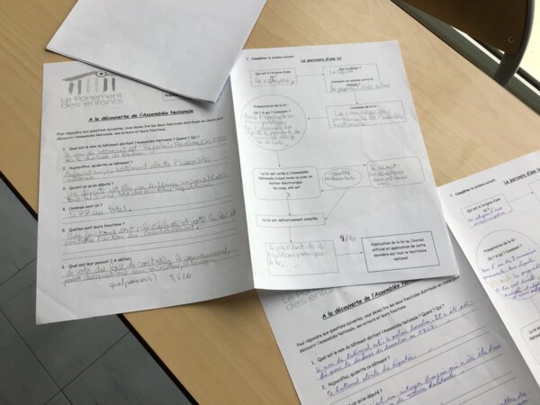 2e étape : Découverte de l'Assemblée Nationale grâce aux documents envoyés par la division de la communication. Nous avons décrit le rôle des députés, des lois et le fonctionnement de cette assemblée. Ce travail a donné lieu à un travail à la maison dans le cadre de l'EMC.