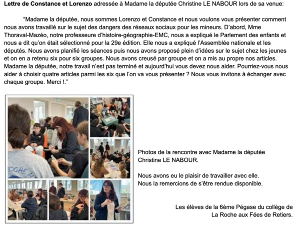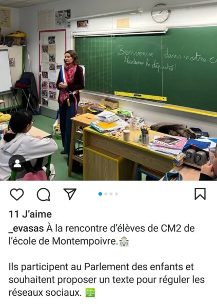 Le vendredi 30 janvier 2026, Mme METTE nous a rendu visite au collège de Saint Selve. Cette rencontre a été l'occasion pour les élèves de lui poser des questions sur la fonction de député et sur l'organisation de son travail. Ils lui ont également présenté leur projet de loi sur le "sharenting". S'en est suivi un débat très enrichissant qui nous a permis d'avoir un retour très positif sur le travail des élèves.